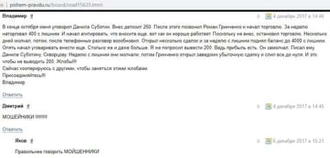 Клиенты брокерских контор настолько доверчивы, что ведутся даже на людей которых впервые слышат. Все началось со звонка Данилы Суботина, который представился сотрудником мошеннической конторы Литт Инвест. Он уломал свою жертву на 250 долларов и передал на обработку следующему лохотронщику, который помогал торговать, его звали Роман Гринченко. За неделю удалось наторговать около 400 долларов и сразу же начал вымогать внести еще депозит, так как ему влом торговать на маленькие деньги. Человек отказался и после этого он молчал несколько дней. Но спустя время появился и разогнал депозит до 4000 долларов. И снова начал капать на мозги своими уговорами на новый депозит. Клиент почуял неладное и решил вывести 200 долларов, но в итоге прозвучало только молчание. Молчал и Данила Суботин, и Скворцов - это тоже из партии лохотронщиков. После Гринченко открыл минусовую сделку и все слил.