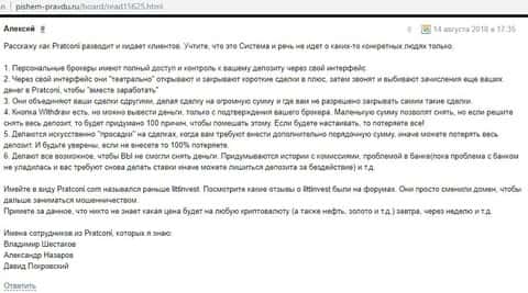 Порой после долгой мошеннической деятельности контора начинает постепенно терять свои позиции на финансовом рынке и нужно что-то делать, чтобы люди снова поверили в аферу и понесли денюжки. Брокерская компания LittInvest так и сделала, теперь она называется Pratconi. Эта новая контора работает по тем же схема, что и все остальные кухни, то есть: брокеры имеют полный доступ к вашим данным и счету, торгует на вашем счете и вымогают еще денег, вывести деньги нельзя, искусственные просадки по депозиту, придумывают истории на объяснение не вывода. Поэтому все эти признаки указывают на кухонность "нового" брокера, это по большей части ребрендинг. В данной кухне замечены: Владимир Шестаков, Александр Назаров, Давид Покровский, Александр Койфман, Сергей Булдаков, Игорь Кан, Никита Кривошеев, Анна, Дарья. Так что читайте отзывы о дилинговом центре LittInvest и получите полную картину подноготной ДЦ Pratconi.