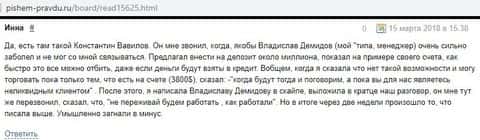 Как под копирку брокерская кухня Литт Инвест ворует у своих клиентов деньги используя старые методы. Аферистам сначала удалось уложить клиента на 2000 долларов, обещая несметную прибыль. И вправду поначалу даже заработали 5600 долларов, часть из которых клиент захотел вывести. И как ни странно сразу все начали не выходить на связь. Первым кто позвонил был Владислав Демидов, а потом звонил еще начальник финансового отдела Олег Скворцов. Вот как раз эти ребята пропали, а в этот момент были открыты крупные сделки. Но брокер не покинул свою жертву и подсунул новых балаболов Илью Тихомирова и Марию из финотдела. Они сообщили, что счет в большой просадке и нужно докинуть 1010 долларов. На что и повелась жертва лохотрона, но не сдавался и продолжал настаивать на выводе средств. Спустя некоторое время счет закрылся по маржин-коллу и на счету осталось 15 долларов. После звонили Дарина Белова и Давид Покровский, которые вымогали закинуть еще 1600 долларов.