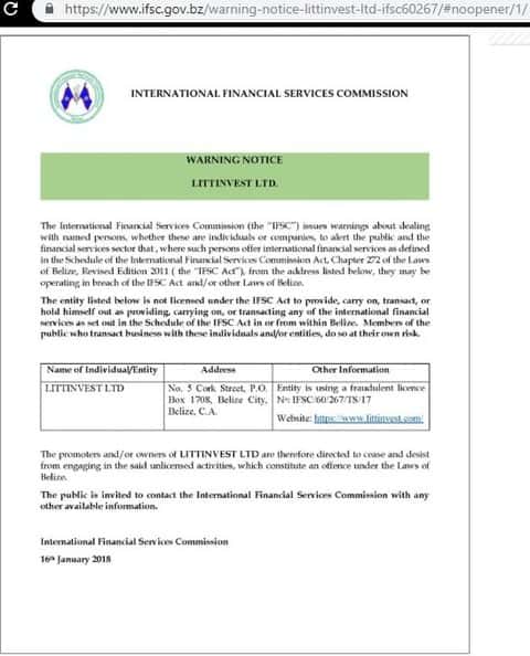 Регулятор финансовых рынков Белиза предупредила всех о том что брокерская контора LittInvest ложно утверждает о международной регистрации в IFSC. Также фирма не имеет лицензии и регистрации в комиссии или иных органах власти в стране. По их словам брокер обращался к гражданам разных стран без какого-либо разрешения и сфальцифицировала регистрацию в управлении финансовых услуг Сент-Винсента и Гренадин. Таким образом компания ведет откровенно мошенническую деятельность даже на уровне высших регулирующих органов. Судя по отзывам и жалобам оно и не удивительно, что контора Литт Инвест кидает всех подряд без разбора. Так что берегитесь мошенников!!!