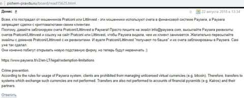 Мошеннические организации LittInvest и Pratconi используют свои счета в финансовой системе Paysera, а в этой системе запрещены сделки с криптовалютами. Обман красуется на виду, поэтому можно повлиять на этот процесс и привнести неприятности в аферу этих компаний. Нужно обратиться в техподдержку Paysera и сообщить о том, чем ее клиент занимается. Таким образом можно заблокировать счета этих мошенников, чтобы они прекратили свою деятельность, либо им придется регистрировать новые подставные компании. Отправляйте номера счетов аферистов и вместе мы остановим этого монстра.