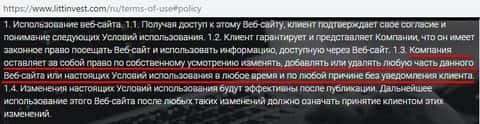 Согласно раздела 1 Клиентского соглашения брокерской организации Литт Инвест, кухня имеет за собой право по собственному усмотрению изменять, добавлять или удалять любую часть и в любое время часть своего веб-сайта и условий пользования без каких-либо уведомлений клиента. То есть мошенники могут поменять правила игры, даже если вы найдете подвох компании и будете иметь возможность вернуть деньги.