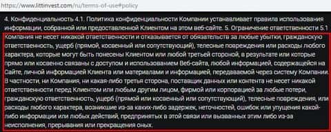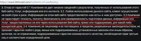 По 3 разделу Клиентского соглашения брокерской кухни LittInvest можно сказать, что они отказываются от ответственности того, что они предоставляют и не гарантируют точность, полноту, безопасность подготовки данных, информации или услуг. Одной фразой можно сказать, что это безответственность со стороны мошенников.