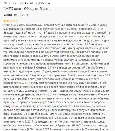 И в этом отзыве клиент рассказал, что у него до сих пор стоит вопрос, который касается вывода денег из дилинговой конторы ЛМ ФХ. Жулики продолжают клиента кормить завтраками и таким образом уже дотянули очередной не вывод до нескольких месяцев. Конечно жертва не рекомендует связываться с шаражниками LMFX.