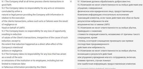 В договоре конторы ЛМ ФХ также много подводных камней, которые могут послужить предлогом для увиливания от ответственности со стороны форекс-аферистов. Жулье четко указывает между строк, что они не несут ответственность за те убытки, которые понесут их клиенты по вине конторы.