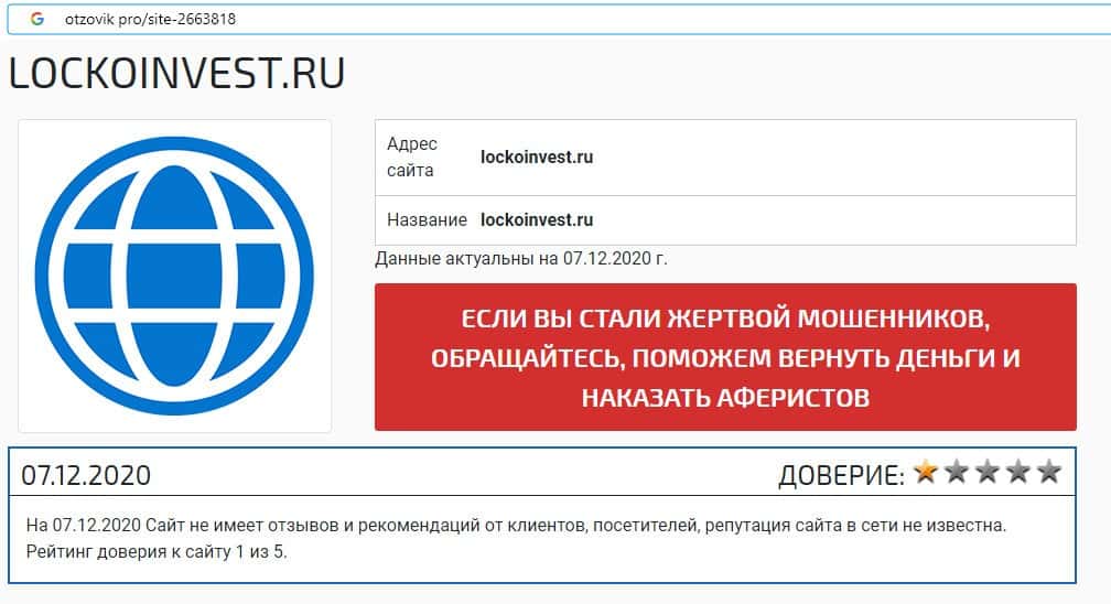 Доверять мошеннической организации Locko Invest не рекомендуем, поскольку судя по всему аферисты подчищают информацию о своей компании удаляя отзывы в сети-интернет.