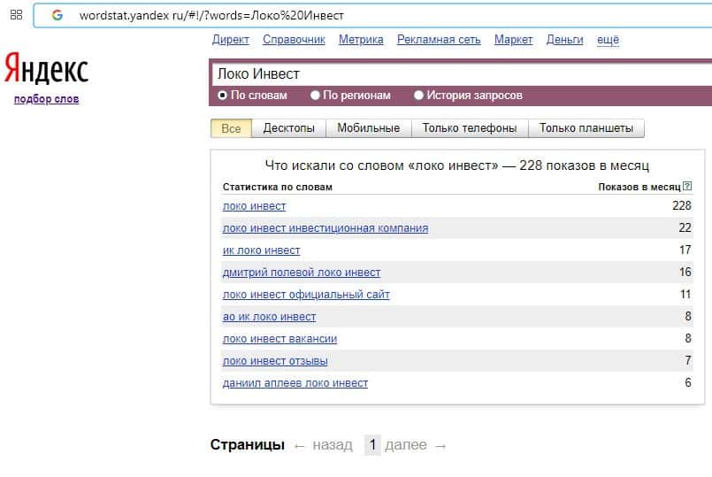 Количество брендовых запросов названия компании на русском языке "Локо Инвест" на Яндекс Вордстарт составляет 228 показов за месяц.