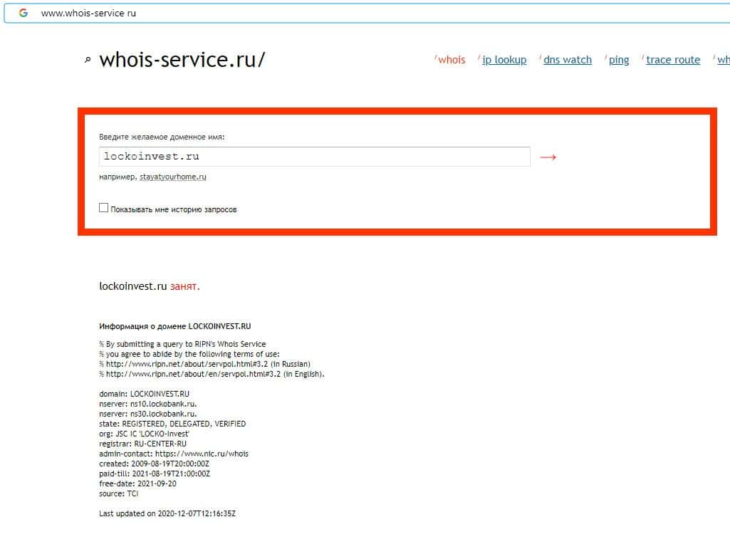 - Возраст домена псевдо-брокерской организации Локо Инвест