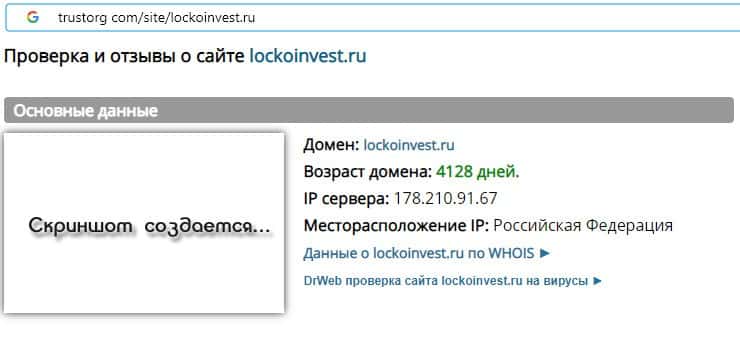 Проверка интернет-сервиса аферистов Locko Invest на trustorg com показала, что возраст домена к моменту написания статьи составляет 4128 дней, вероятнее всего домен купленный.