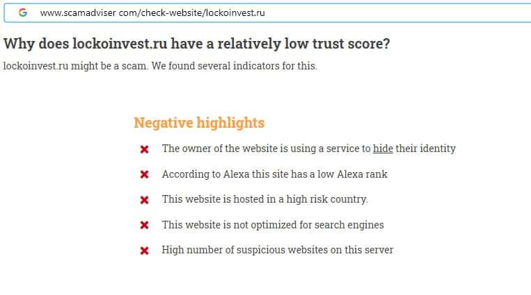 Проверка Локо Инвест на сайте скамадвайсер ком показала, что у данного сайта низкий рейтинг, а также выявлено множество отрицательных моментов в работе сервера.