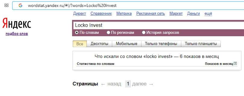 Количество брендовых запросов название домена компании "lockoinvest.ru" на wordstat yandex ru составляет 1 показ за месяц.