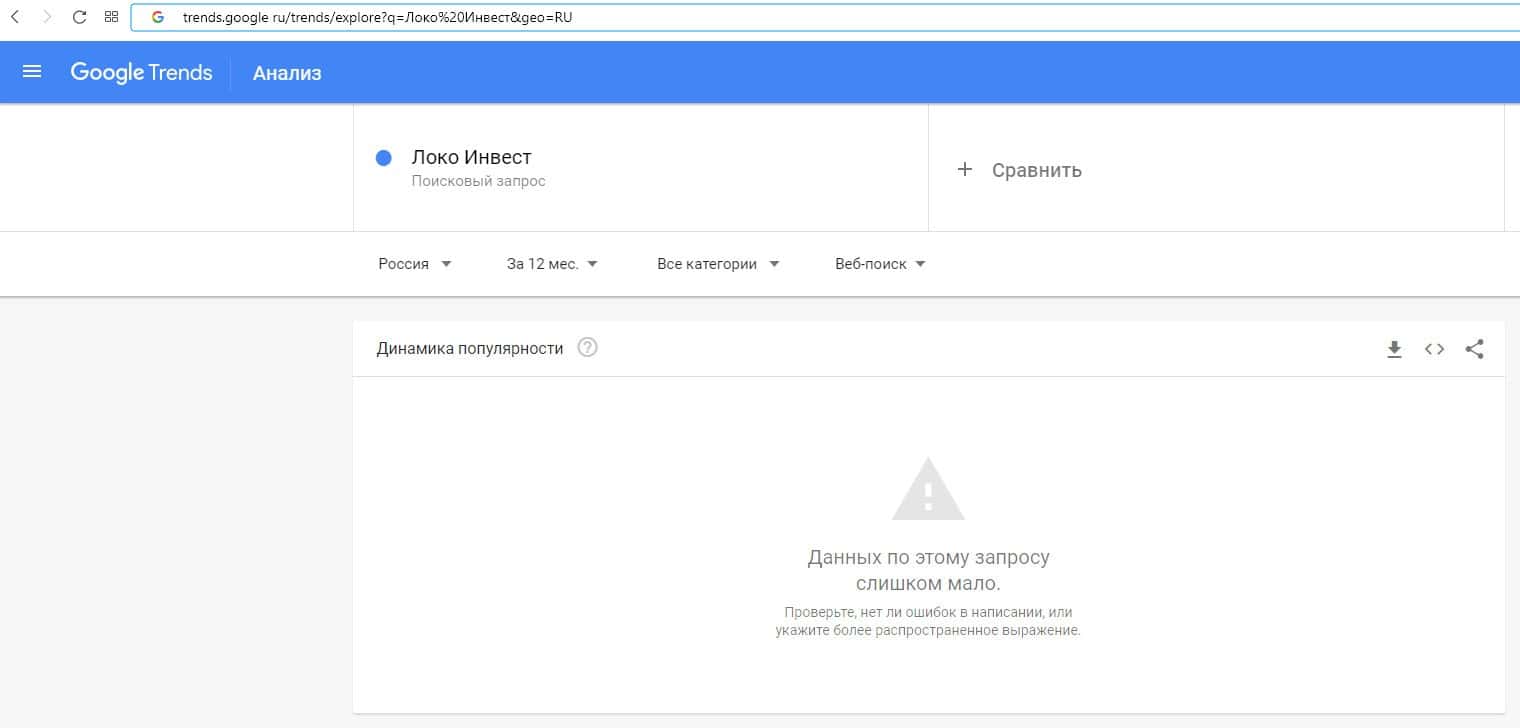 По количеству брендовых запросов названия компании на русском языке "Локо Инвест" на Гугл Трендс данные отсутствуют.