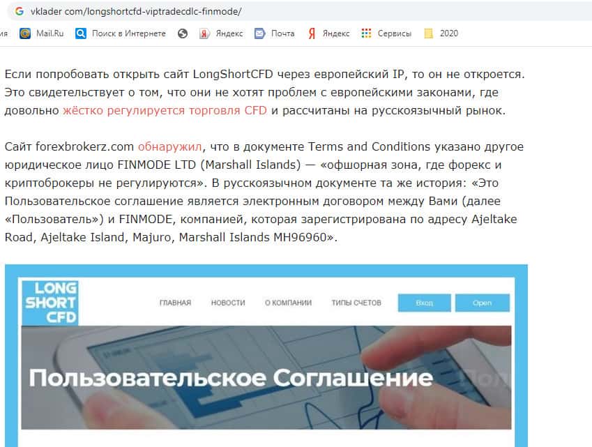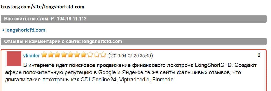 Официальный сайт мошенников LongShortCFD через европейский IP никогда не открывался. Это означает то, что они избегали проблем с европейскими законами. Так как в Европе торговля CFD довольно жёстко регулируется, то и рассчитывали лоховоды LongShortCFD в основном на русскоязычный рынок. К тому же и трейдеры здесь не такие привередливые как европейские!Несмотря на то, что на сегодняшний день официальный сайт шарамыжники LongShortCFD прикрыли, но по прежнему продолжают функционировать сообщества шараги в соцсетях. Так что необходимо понимать, что просто так аферисты не остановятся и будут продолжать искать новых доверчивых трейдеров! Сообщество жуликов на Facebook, facebook com/longshortcfd/