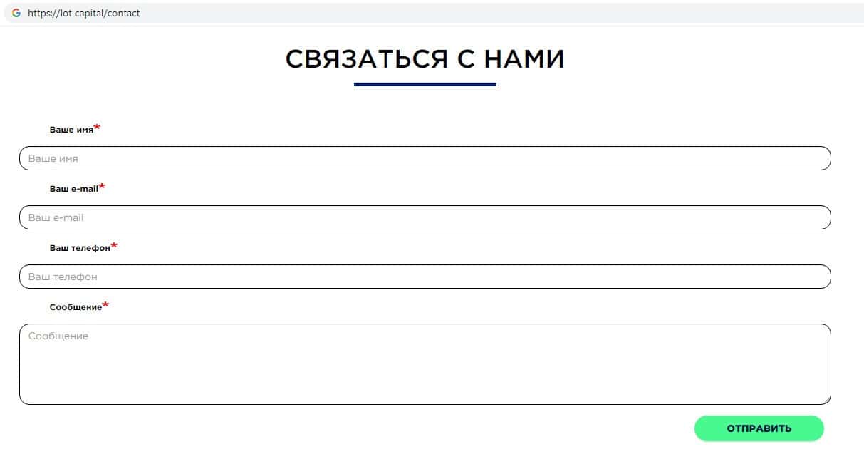 Аферисты Lot Capital предлагают пользователям заполнить бланк обратной связи, где просят указать свое имя, фамилию, адрес электронной почты и номер контактного телефона.