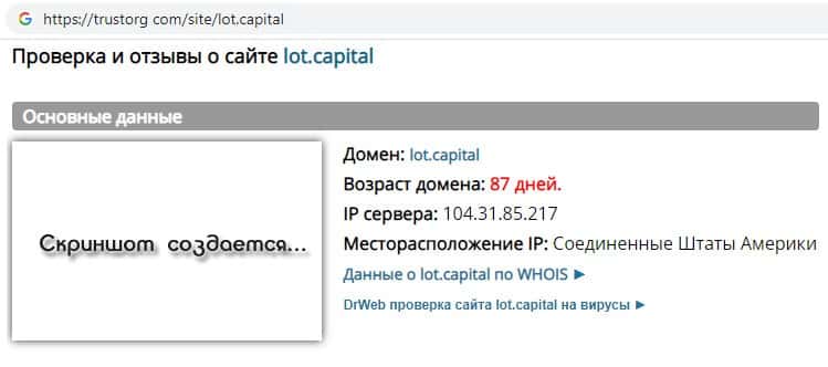Проверка интернет-сервиса обманщиков Lot Capital на trustorg com показала, что возраст домена к моменту написания статьи составляет 87 дней, скорее всего домен купленный.