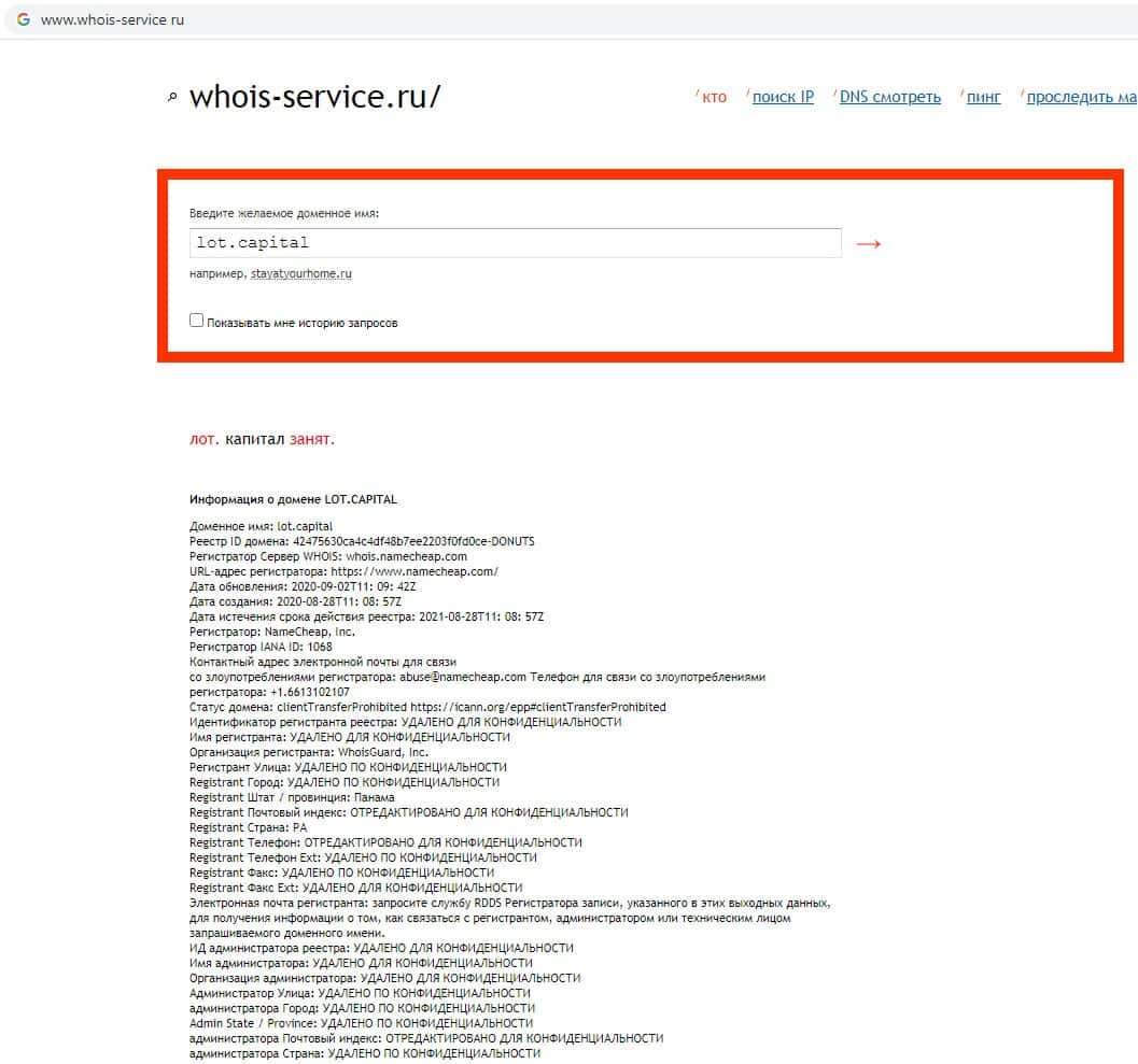 - Данные о владельце домена псевдо-брокера Лот Капитал
