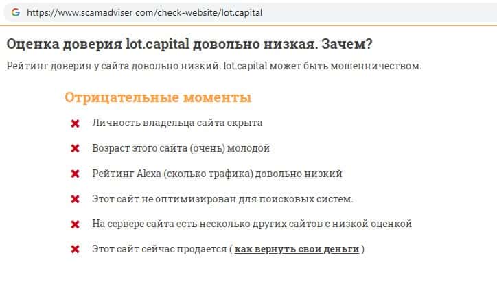 Проверка шараги Лот Капитал на сайте scamadviser com показала, что у данного сайта низкий рейтинг, а также выявлено множество отрицательных моментов в работе сервера.