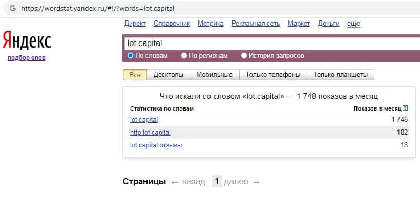Количество брендовых запросов названия компании на английском языке без пробела "LotCapital" на Вордстарт Яндекс Ру составило 2 показа за месяц.