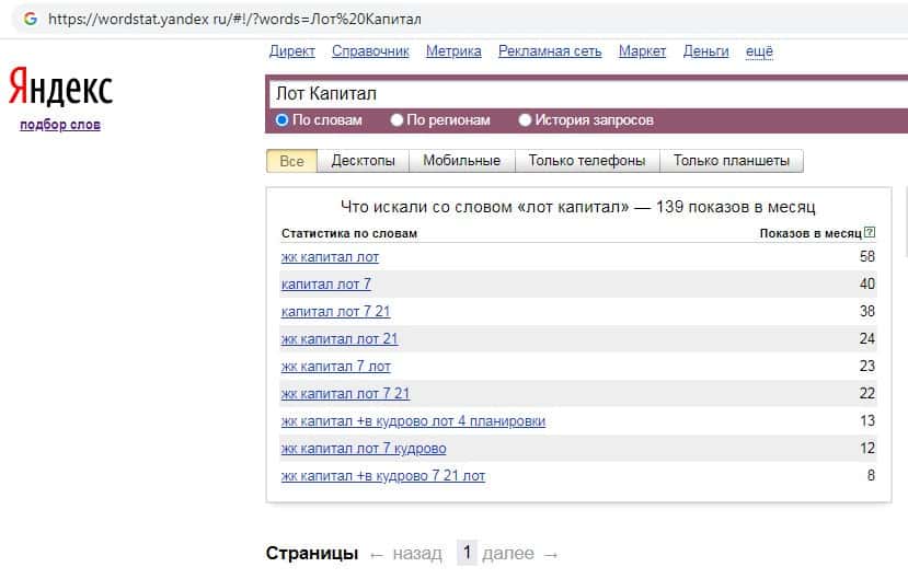 Количество запросов по бренду названия компании на русском языке "Лот Капитал" на wordstat yandex ru составляет 139 запросов за месяц.