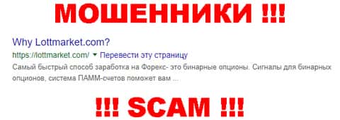ЛОТ МАРКЕТ - очередные мошенники сети интернет, которые в течении более чем четырех лет занимаются разводом честных трейдеров на деньги путем обмана и вранья о легкой прибыли, благодаря которым наивные клиенты аферистов LOTTMARKET ведутся на данный лохотрон. Связываться с жуликами ЛОТ МАРКЕТ настоятельно не советуем !!!