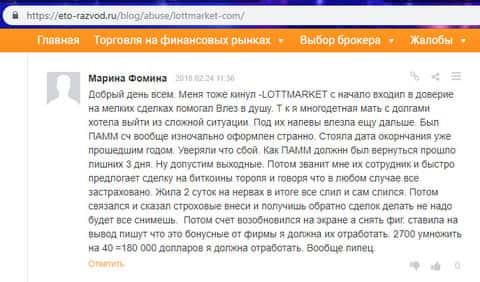 Для менеджеров-аферистов шулеров ЛОТ МАРКЕТ нету разницы какое у вас финансовое положение, их главная цель развести вас на как можно большее количество средств, ради чего аферисты идут на отчаянные поступки и обещают заоблачные результаты. На изображении ниже вы можете увидеть очередной негативный отзыв о сливе счета обманутой клиентке.