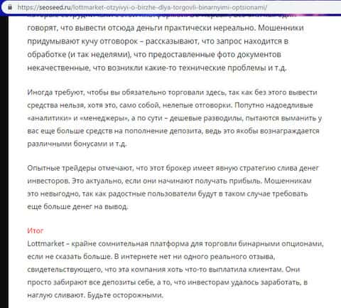 Не вызывают доверия шулера ЛОТ МАРКЕТ и у сайта сеосеед ру, автор которого так же разместил негативный материал о деятельности мошенников у себя на сайте. На изображении ниже вы можете увидеть выводы автора материала о ненадежности жульнического проекта по разводу трейдеров на деньги в лице конторы аферистов LOTTMARKET.