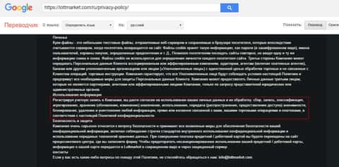 Заканчивается политика конфиденциальности у мошенников ЛОТ МАРКЕТ на волне того, что они могут передавать ваши личные и персональные данные в те конторы, в которые аферисты LOTTMARKET сами и захотят. На изображении ниже вы можете увидеть конечные условия шулеров ЛОТ МАРКЕТ которые не гарантируют нормальной сохранности данным.