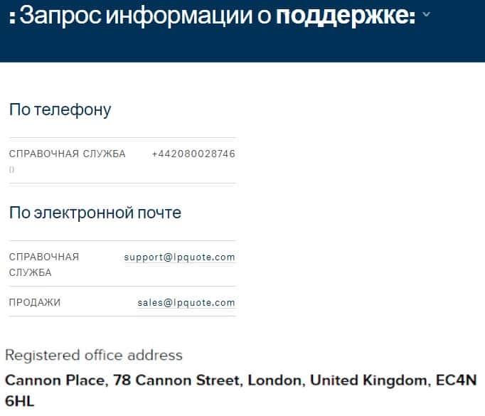 На официальном сайте консалтинговой компании LPQuote Com опубликованы для контакта следующие весьма скромные сведения: