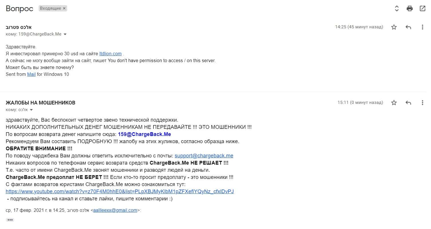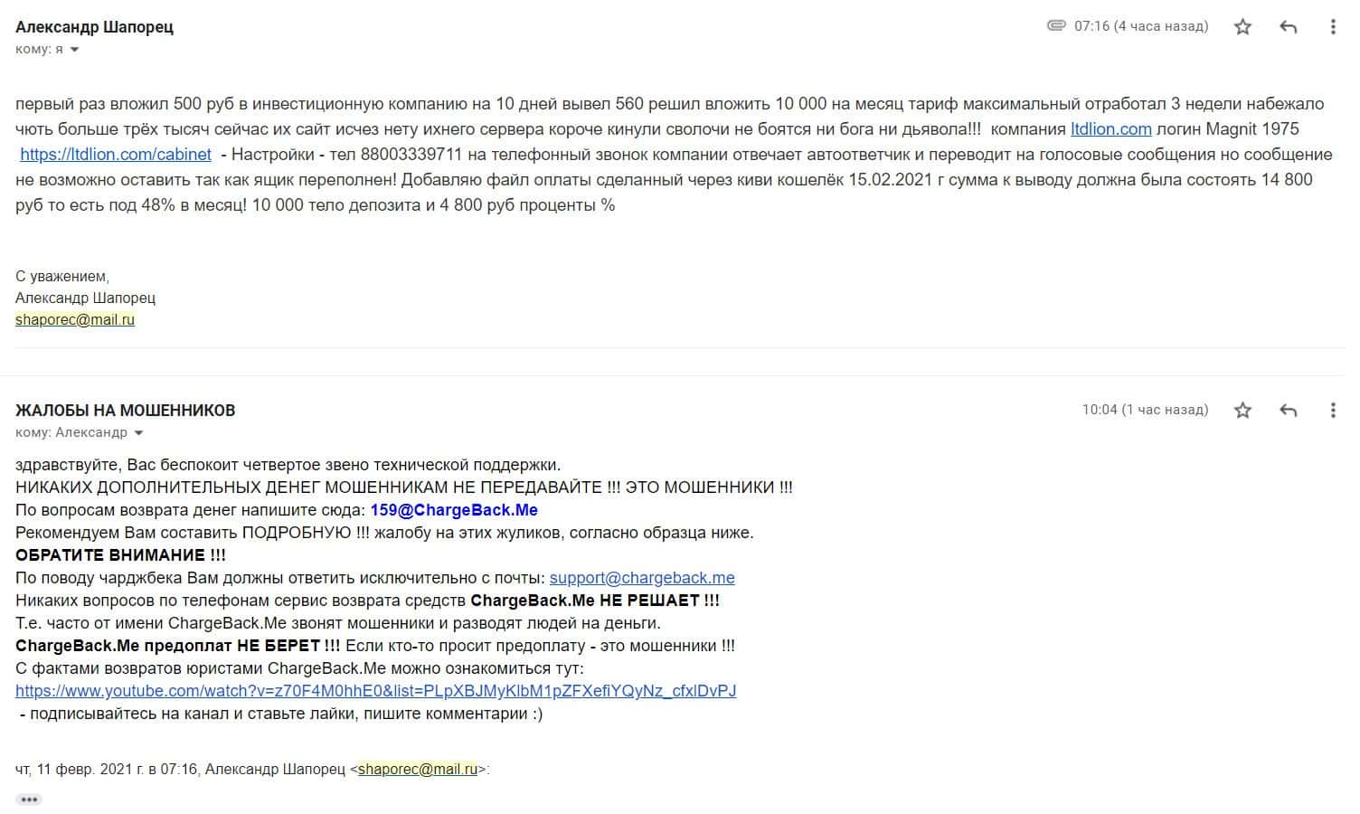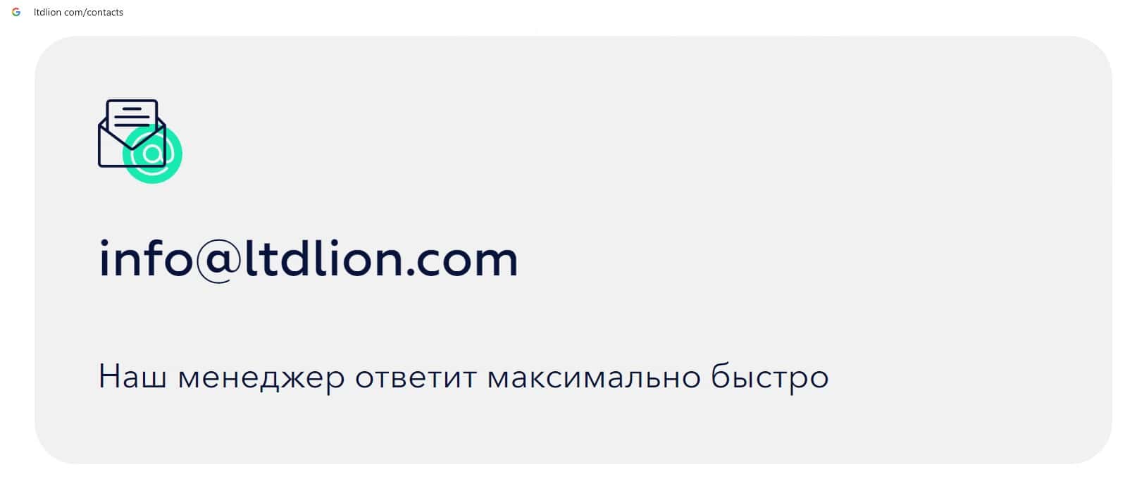 Аферисты ЛТД Лион на своем официальном интернет-ресурсе указывают адрес электронной почты, а именно: