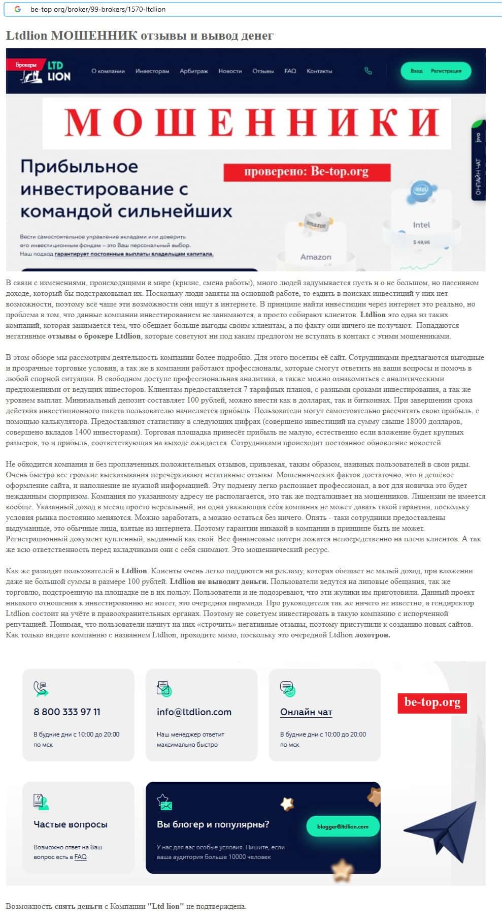 Во всемирной паутине есть множество подтверждений того, что скам-контора LTDLion это банальный развод на деньги и не более, одним из которых является данный обзор.