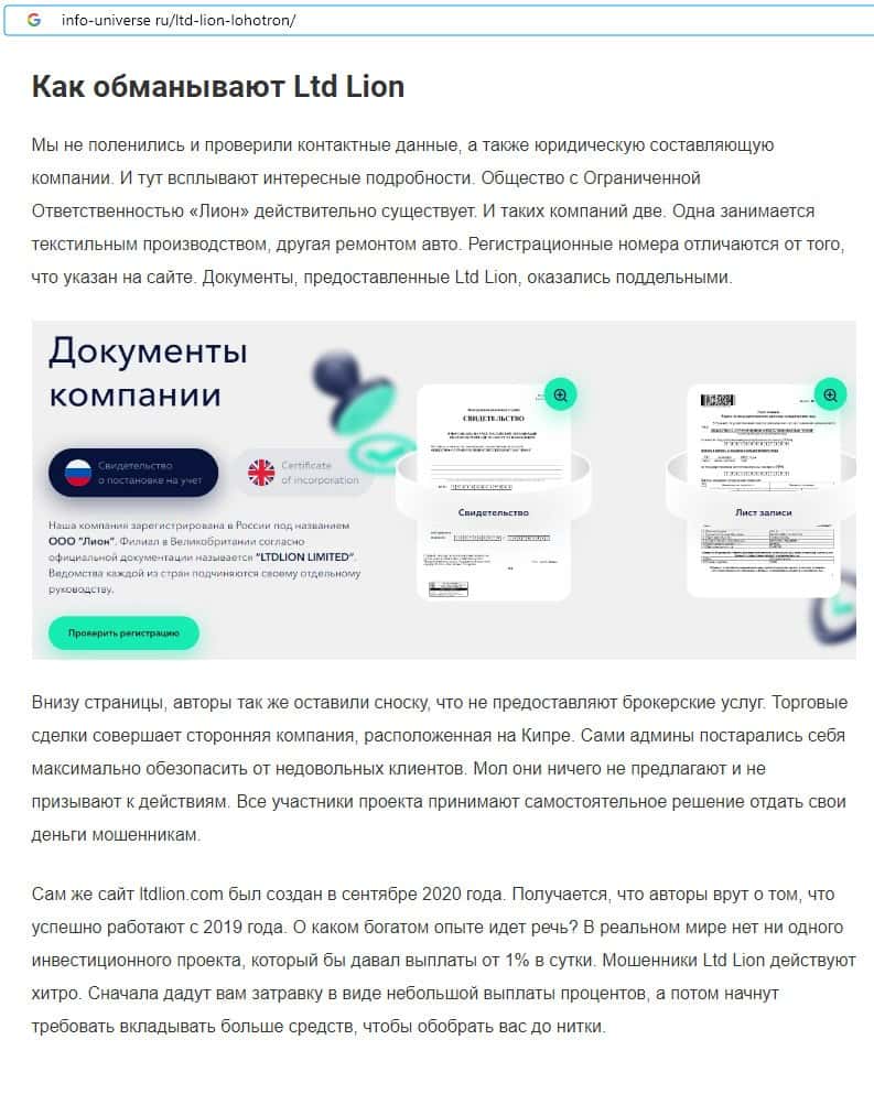 - Вся информация о компании на сайте мошенников ЛТД Лион - фейк !!!
