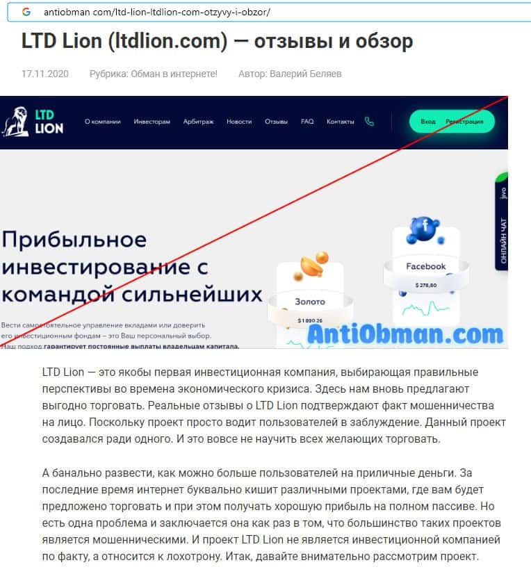 Компания ЛТД Лион лишь создает видимость того, что является инвестиционной, в действительности обманщики лишь разводят людей на деньги и врут о надежности компании.