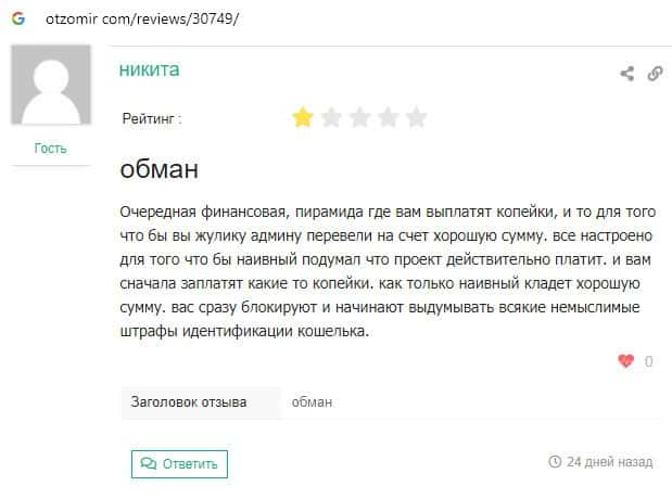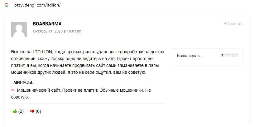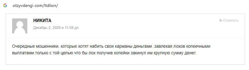 Автор данного отзыва пишет, что перед нами очередной мошеннический проект LTDLion, который не платит людям ни копейки, забирая все деньги себе в карман.