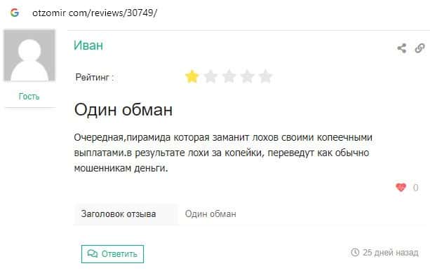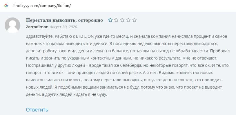 Далее предлагаем ознакомиться с пользовательским отзывом о том, что жулики ЛТД Лион не платят обещанную прибыль, а лишь занимаются разводом как аналогичные конторы.