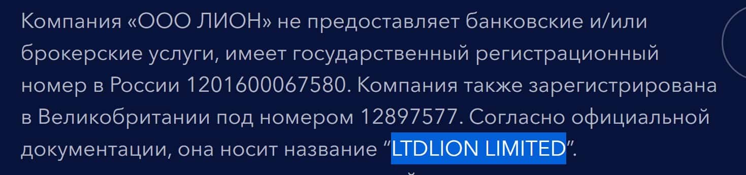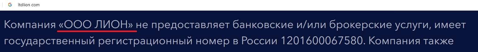 На сайте обманщиков так же указано еще одно юридическое лицо "LTDLION LIMITED", которое управляет интернет-лохотроном ЛТД Лион.