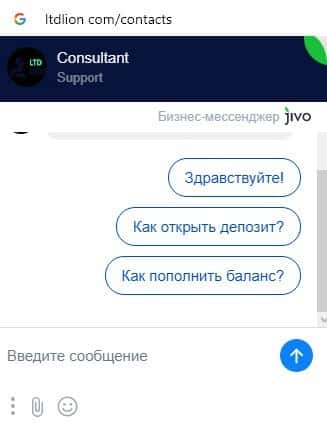 Также обманщики LTDLion предоставили в качестве обратной связи онлайн-чат, при помощи которого ведут сбор данных о клиенте, фиксируя все данные на сайте.