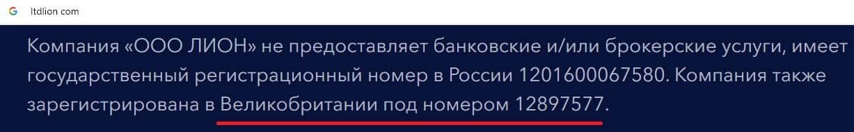 На своем официальном сайте шулера ЛТД Лион предоставили регистрационный номер своей компании, который представлен на скриншоте ниже.