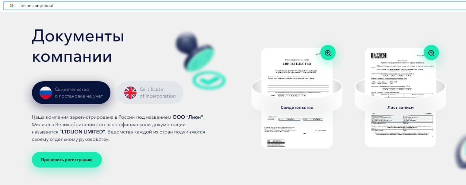 Вместо лицензии компании мошенники LTDLion на своем дырявом сайте предоставили сертификат о регистрации, который вероятнее всего им не принадлежит.