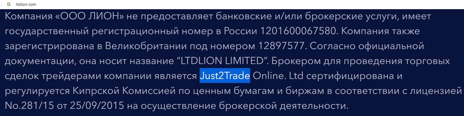 - Скам-проект LTD Lion работает в одной связке с псевдо-брокером Just 2 Trade