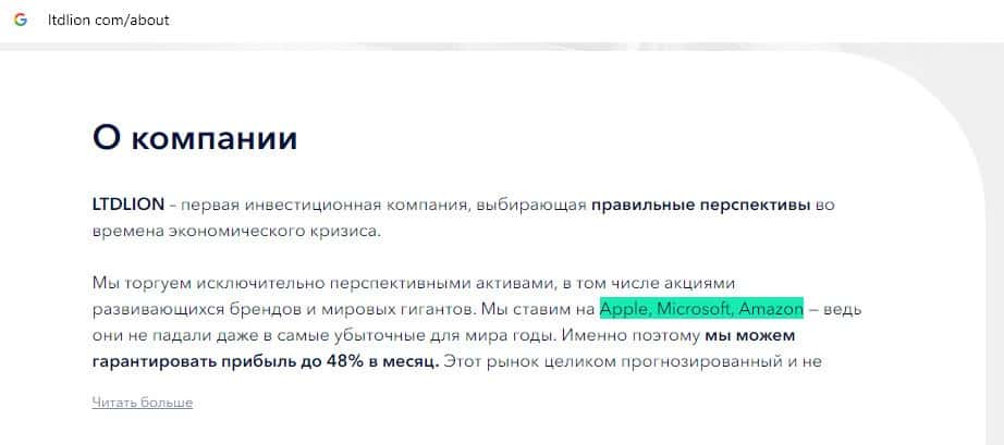 На сайте шараги ЛТД Лион о прибыльном инвестировании не может быть и речи, все положительные отзывы о компании не правдивые, купленные.
