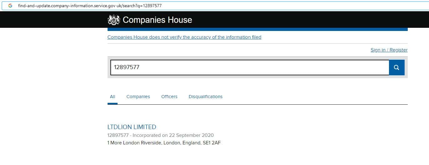 На официальном сайте реестра компаний Великобритании beta companieshouse gov uk есть некая информация о компании LTDLion, но лицензии у данной скам-организации нет.