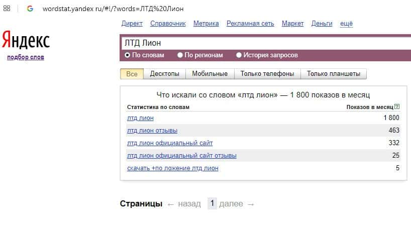 Количество брендовых запросов названия компании на английском языке "LTDLion" на wordstat yandex ru составляет 1164 запроса за месяц.