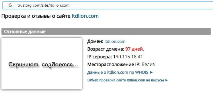 Проверка интернет-сервиса аферистов LTDLion на trustorg com показала, что возраст домена к моменту написания статьи составляет 97 дней, вероятнее всего домен купленный.