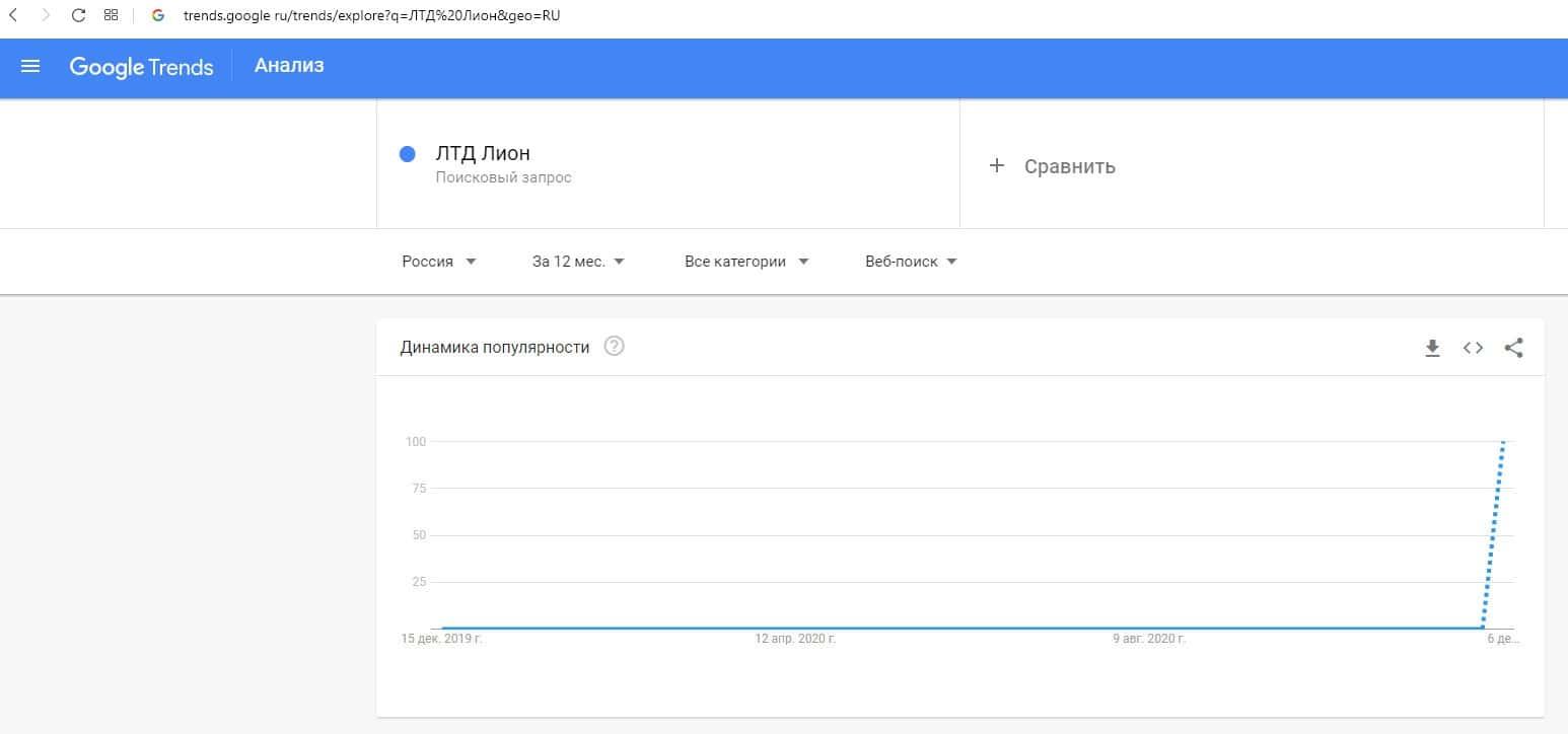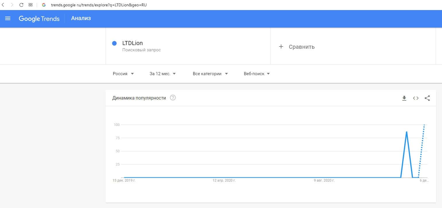 Количество запросов по бренду названия компании на английском языке "LTDLion" на trends google ru отображено на графике на скриншоте ниже.