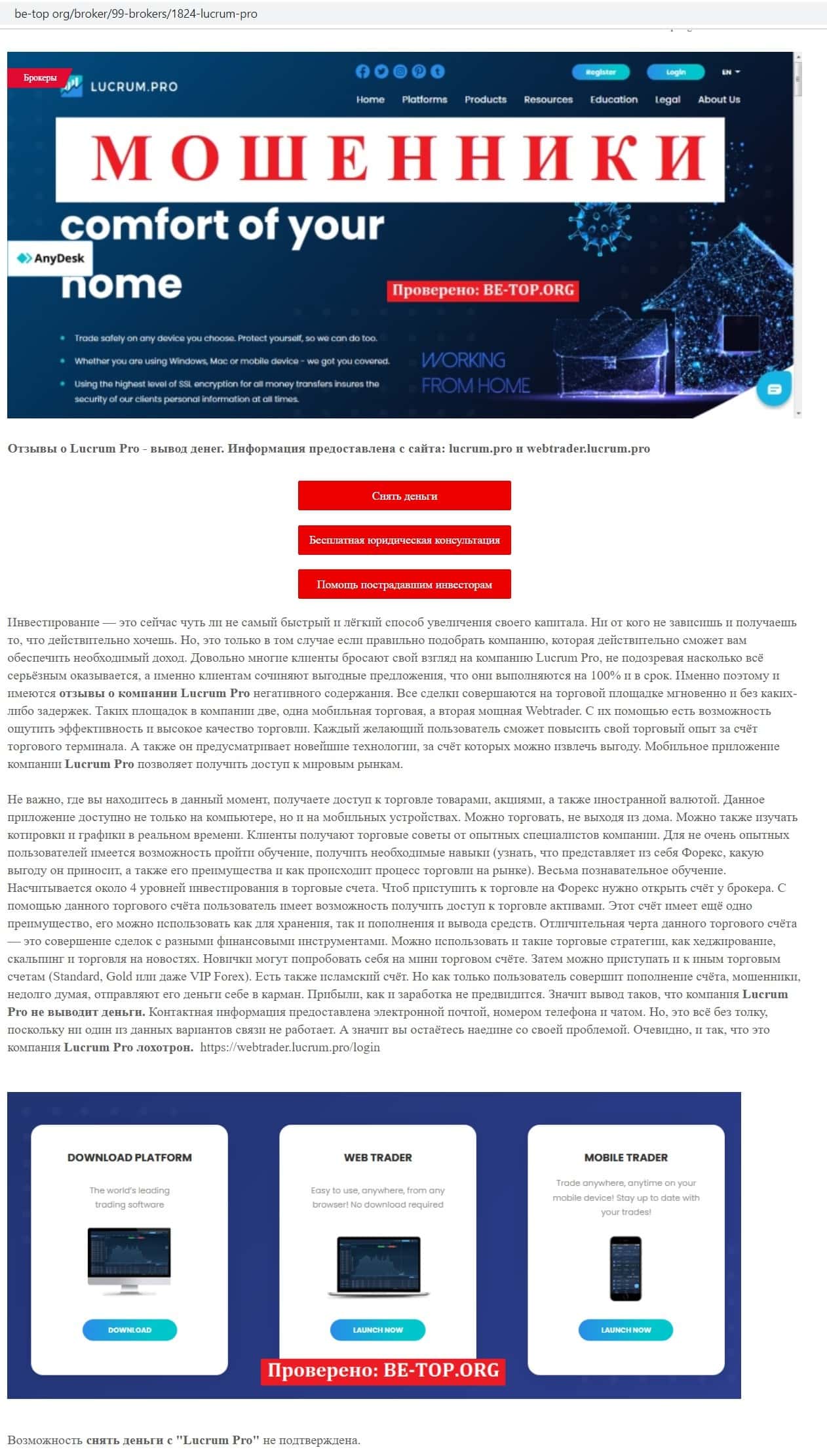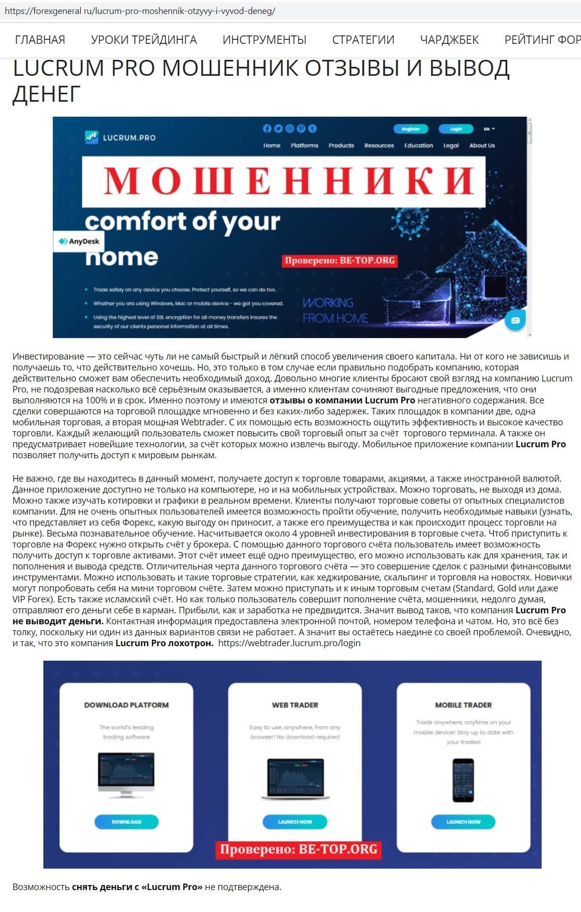 Сайт be-top org не советует связываться с конторой Lucrum Pro, так как возможность снятия денег от этого брокера еще никем не подтверждена, сайт сомнительный.