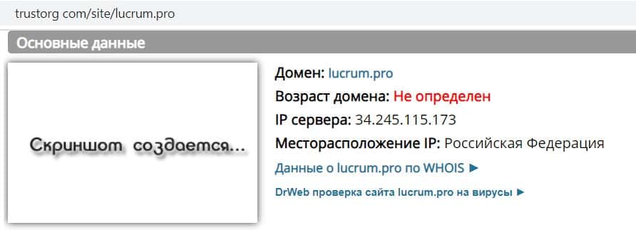 Сервис проверки доменов Трасторг не смог определить возраст сайта lucrum pro, так как мошенники, создавшие его, скрывают всю информацию о своем ресурсе.