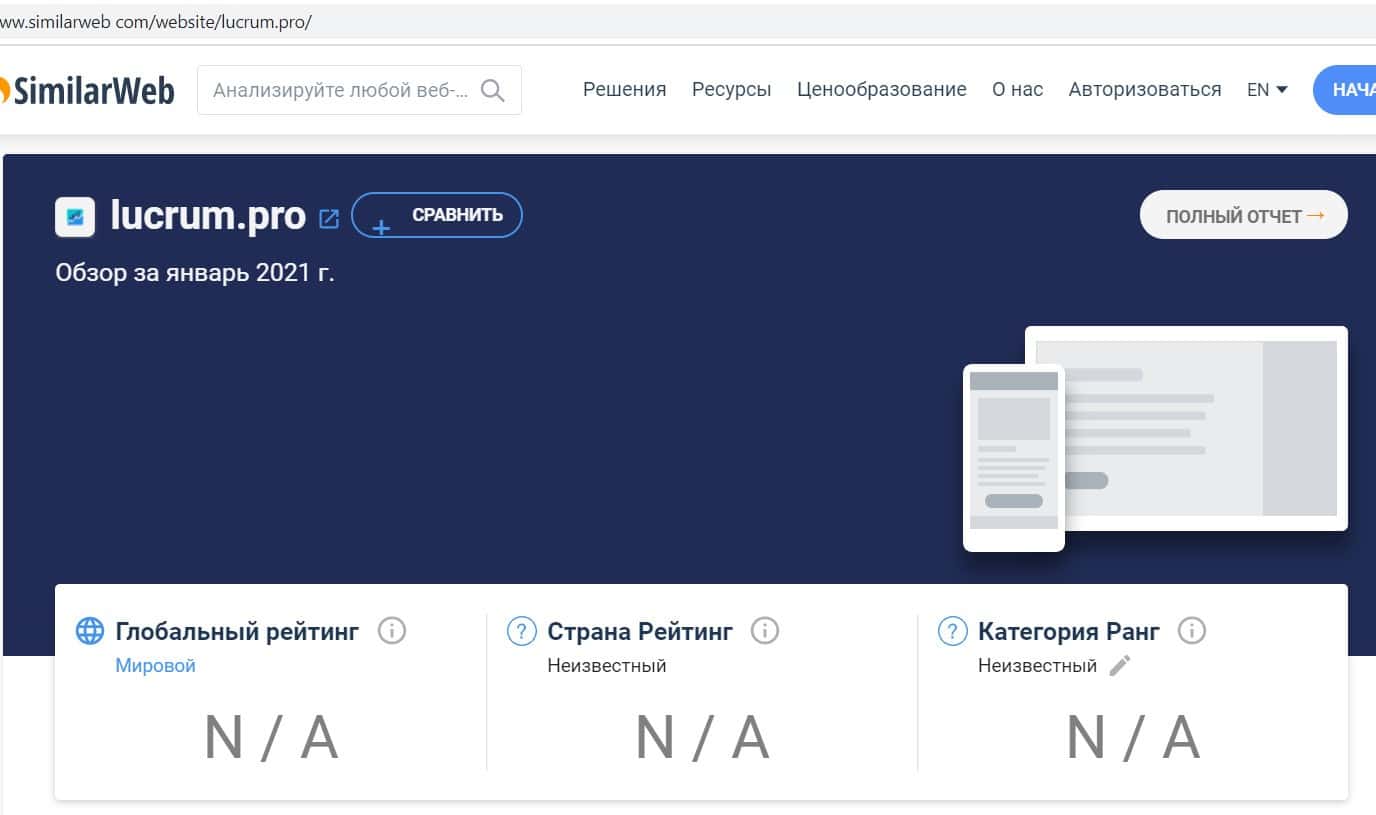 Сайт проверки трафика компаний Симиларвеб не смог найти сайт lucrum pro в своей базе. Это означает, что Лукрум Про - недавно созданный лохотрон, о котором нет сведений.
