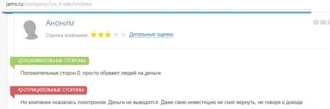 Далее представлены комменты от любителей внебиржевых игр, которые столкнулись с разводняком в жульнической организации Lux Trade. Клиенты сего явного forex-лохотрона пишут о том, что вывести собственные деньги здесь не удастся.