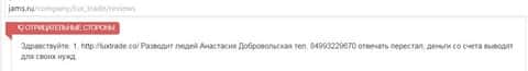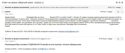 Если лохотронщики из Лукс Трейд и Вас ограбили, то в такой ситуации обязательно напишите про этот факт нам. Сообщите свой e-mail в форме для обратной связи чуть ниже, и с Вами установят связь.