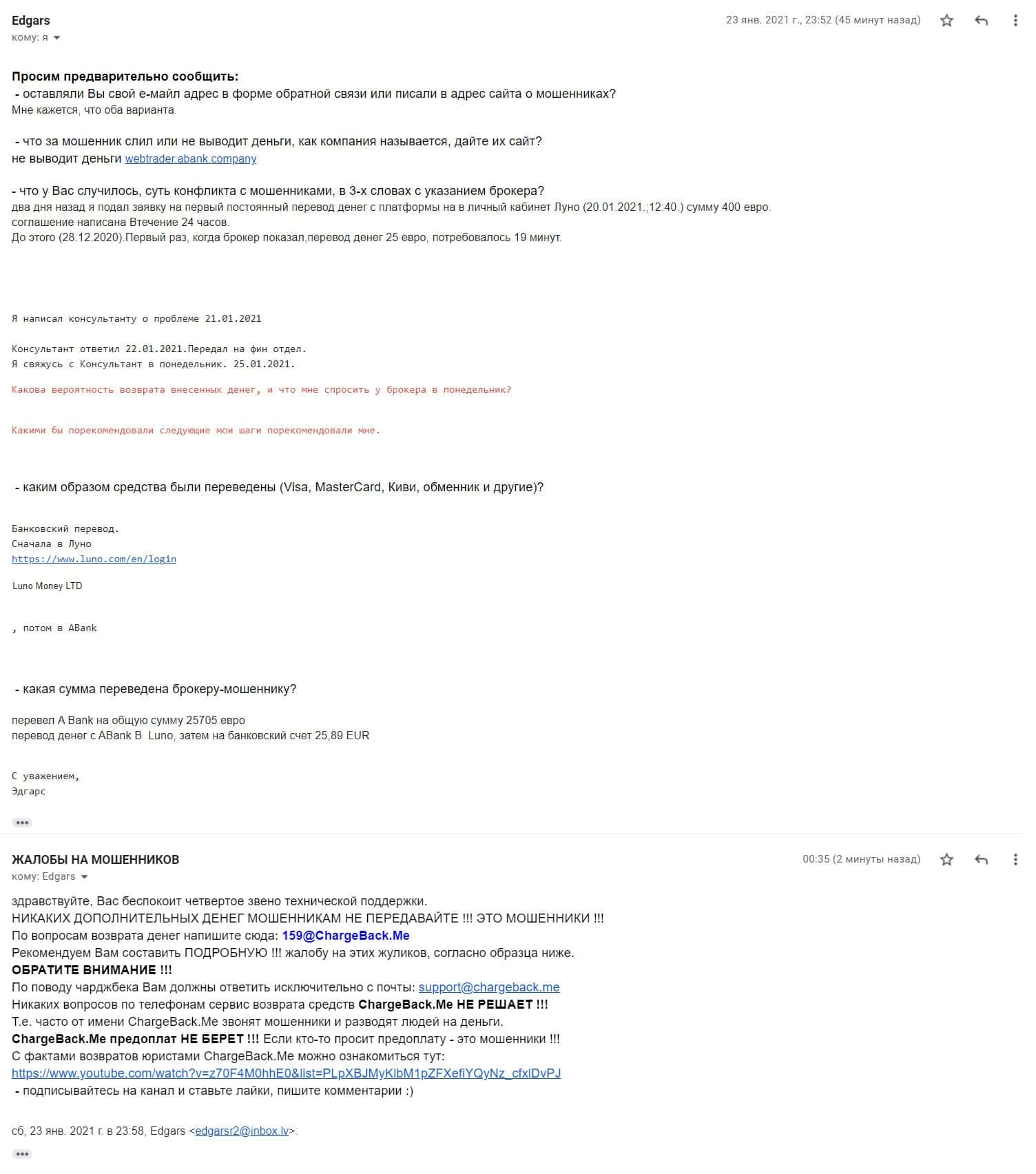 На почтовый адрес сайта по сбору информации о деятельности мошенников форекс пришла жалоба на контору Луно, которая развела клиента совместно с жуликами Abank Company.